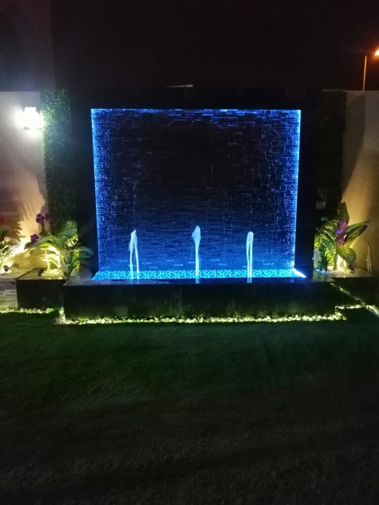 الإضاءة أيضًا تلعب دورًا مهمًا في إبراز جمال الشلالات، خاصة في الليل. يتم استخدام إضاءة LED مخصصة مقاومة للماء، تُوضع بشكل استراتيجي لإظهار تدفق المياه ولمعانها، مما يخلق مشهدًا بصريًا ساحرًا. ويمكن التحكم في ألوان الإضاءة حسب الرغبة لإضفاء طابع مميز على الحديقة. وتولي مؤسسة حديقتي اهتمامًا كبيرًا بتصميم الإضاءة بما يتناسب مع بقية عناصر الحديقة.